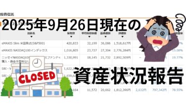 投資 【PCE/雇用統計】2025年9月26日 最新の資産運用状況まとめ(S&P500/NASDAQ100/全米株式) こんにちは!インデックス投資を続けている上級初心者(⇨運営者情報はこちら)です!2025年9月26日現在の資産運用状況についてご報告するとともに、今週のマーケットや注目の経済指標の動向について振り返ります。2025年9月19日時点の資産状況... 2025.09.27 投資
