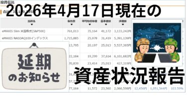こんにちは!インデックス投資を続けている上級初心者(⇨運営者情報はこちら)です!この記事は2026年4月17日現在の資産運用状況についてご報告するとともに、今週のマーケットや注目の経済指標の動向について振り返ります。2026年4月10日時点...