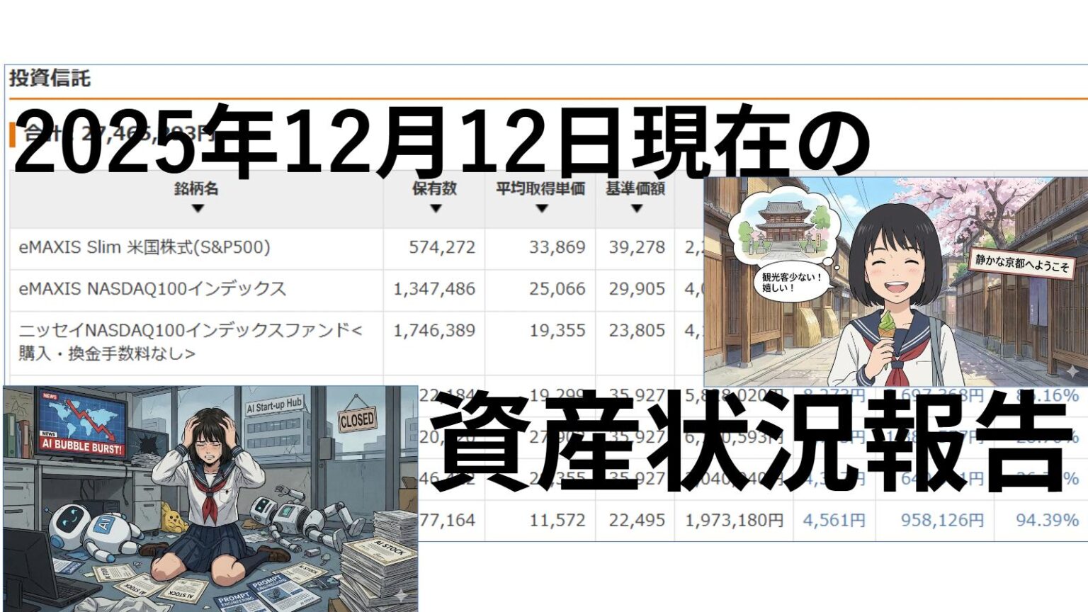 2025年12月12日現在の資産運用状況についてご報告するとともに、今週のマーケットや注目の経済指標の動向について振り返ります。