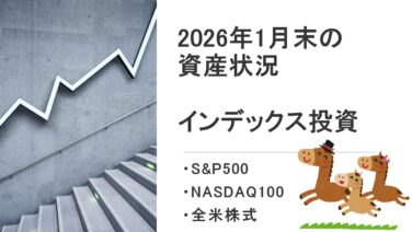 投資 【新NISA25か月目/iDeCo12か月目】2026年1月末の資産状況(S&P500・NASDAQ100・全米株式)【つみたてNISA49か月目】 こんにちは!上級初心者(⇨運営者情報はこちら)です!新NISAを始めて25か月目、iDeCoは12か月目になりました。この記事では、2026年1月末時点の資産運用状況を詳しく報告し、経済指標や金融政策の影響も交えながら、今後の投資戦略につい... 2026.02.01 投資