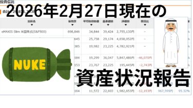 投資 【PPI/雇用統計】2026年2月27日 最新の資産運用状況まとめ(S&P500/NASDAQ100/全米株式) こんにちは!インデックス投資を続けている上級初心者(⇨運営者情報はこちら)です!この記事は2026年2月27日現在の資産運用状況についてご報告するとともに、今週のマーケットや注目の経済指標の動向について振り返ります。2026年2月20日時点... 2026.02.28 投資