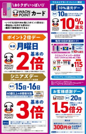 ウエルシア薬局では、毎週月曜日にポイント2倍を実施しています。